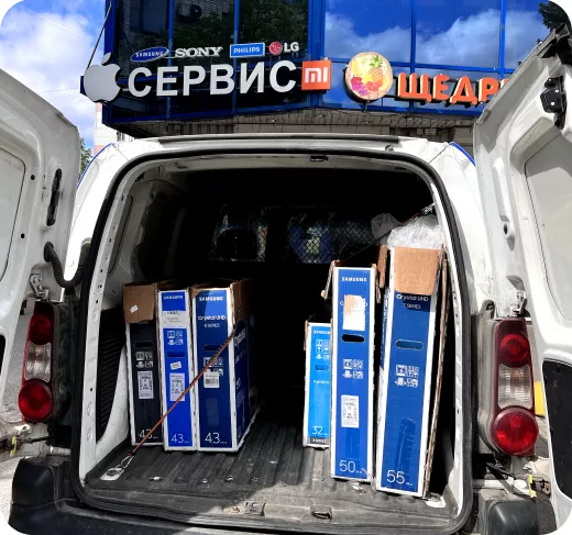 Наш сервисный центр располагает оборудованными автомобилями для транспортировки техники в ремзону. Курьеры бережно демонтируют, упакуют и транспортируют телевизор. После ремонта, техника будет возвращена и установлена на место.